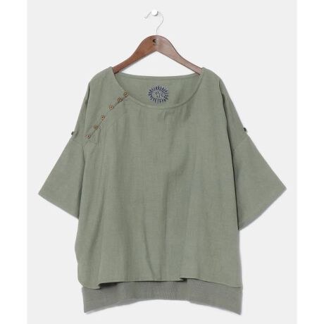 風合いの良い麻混素材で夏にぴったりのビッグシルエットレディーストップス。少し後ろが長めになったハイローヘムのシルエットや、バックスタイルの首元に入った刺しゅう、フロントに斜めに入ったボタンなど、シンプルの中にもこだわりをふんだんに詰め込んだ一枚。袖を折るとタブが付いており袖丈の調整も可能。普段使いのしやすい、無駄をそぎ落とした一品。