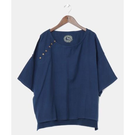 風合いの良い麻混素材で夏にぴったりのビッグシルエットレディーストップス。少し後ろが長めになったハイローヘムのシルエットや、バックスタイルの首元に入った刺しゅう、フロントに斜めに入ったボタンなど、シンプルの中にもこだわりをふんだんに詰め込んだ一枚。袖を折るとタブが付いており袖丈の調整も可能。普段使いのしやすい、無駄をそぎ落とした一品。