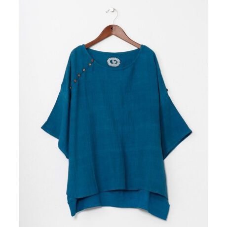 [型番:IDS-4144-2024]ナチュラルな麻混素材のレディーストップス。シンプルながらも刺しゅうやハイローヘム、タブ付き袖など細部までこだわったデザインが魅力。