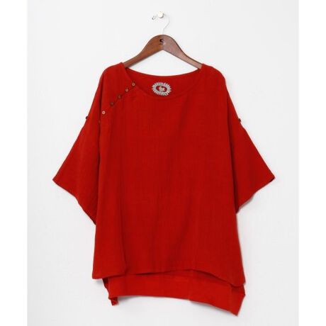 [型番:IDS-4144-2024]ナチュラルな麻混素材のレディーストップス。シンプルながらも刺しゅうやハイローヘム、タブ付き袖など細部までこだわったデザインが魅力。