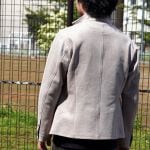 脇の切り替えを出来るだけ前に持って来ることでシャープな印象に仕上げ、衿端にワイヤーを入れることで、衿部分は立てた状態でも折り返した状態でも着用出来る様にしています。