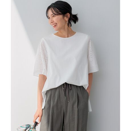 程よい透け感のある、アイレット刺繍の袖がポイントのカットソーです。刺繍柄は袖の形状に合わせて作成することで、手の込んだオリジナルなアイテムに仕上げています。袖の刺繍が主張しすぎず程よく効いているので、シンプルなボトムスに合わせても、ボリューム感のあるスカートなどにインしても、着こなしを楽しんでいただけます。カラーは、爽やかなホワイト(#001)、優しく華やぐライラック(#082)、ダークブラウン(#035)の、3色展開です。