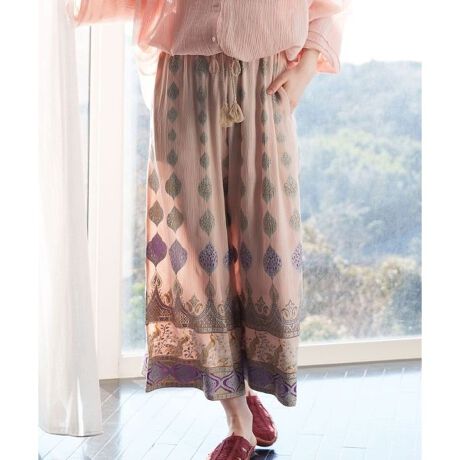 通気性の良いレーヨンクレープ素材のワイドパンツ。インドならではのエキゾチックな色使いが美しい一枚。インドの象徴的なモチーフが描かれた幻想的なテキスタイルは他にはない特別なもの。箔プリントが妖艶さを引き立たせ、インドのバンジャビドレスを彷彿とさせる。きらびやかな一着。