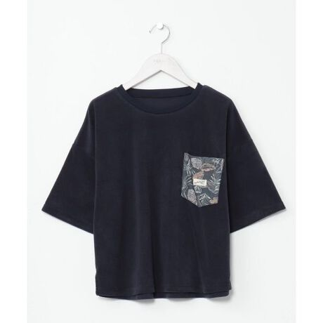 ふわっとした弾力と柔らかい肌触りが心地よい、パイル素材を使用したショート丈Tシャツ。吸水性が高いので、汗をかいても気持ちよく着られます。胸には柔らかな色合いで表現されたボタニカル柄のポケットが付いているのがポイント。