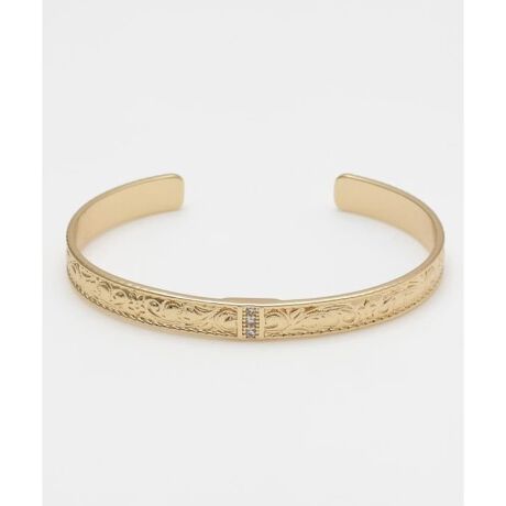 [型番:4CSZ9304-2024]ハワイアンジュエリー調の模様が彫られたプレートバングル。流れるようなマイレの模様は「大切な人との絆」を意味し、隣に一緒に彫られている可愛らしいプルメリアには「魅力を引き出してくれる」という意味が込められているので、大切な方への贈り物にもオススメです。裏面
