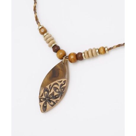 [型番:4IJZ4201-2024]ウッド調のペンダントにポリネシアントライバルが刻印されたネックレス。海の守り神ホヌやプルメリアなどが彫られており、力強さと繊細さが表現されています。男性へのプレゼントにはおすすめです。