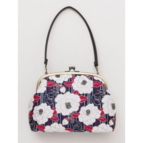 [型番:7JNP0118-2024]大きな椿の花を大胆にあしらった、がま口ハンドバッグ。キラキラとした金糸がアクセントになり、女性らしさをより引き立たせます。椿の花言葉は「誇り」「慎ましい優しさ」。長財布も入るサイズ感と女性らしさを感じさせる上品なデザインは和装にも洋装にも。