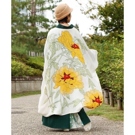 [型番:7IA-4109-2024]牡丹の花を大きくあしらった華やかな振袖風羽織。レーヨン素材を使用し、軽やかでやわらかな着心地です。ゆったりとしたシルエットが上品で、羽織るだけで華やかさを添えてくれます。UVカット加工が施されており、日差し除けとしてもおすすめの商品です。UVカット加工