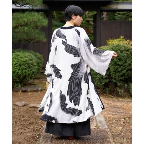 優雅にたゆたう金魚を大胆にあしらったデザインが目を惹く、長丈の着物羽織。着物に倣(なら)い、日常的に和を身に纏って華やかな和装カジュアルスタイルに。柔らかなレーヨン素材で、さらりとした着心地。サイドポケット付き。UVカット加工が施されているので、強い日差しでも安心です。