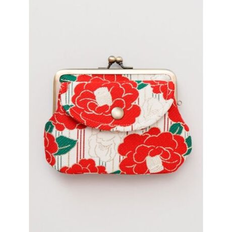 [型番:7JNP0120-2024]大きな椿の花を大胆にあしらった、親子がま口。キラキラとした金糸がアクセントになり、女性らしさをより引き立たせます。椿の花言葉は「誇り」「慎ましい優しさ」。お札と小銭が分けて入れられる便利な親子タイプのがま口財布。前についているポケットにも収納可能なのでより細かく分けられます。