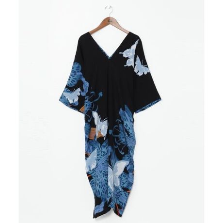 彼岸花、牡丹、菊、蝶を大胆に表現したワンピース。襟元は深めのVネックで見た目もスッキリ。落ち感のあるレーヨン素材は歩くたびにサラサラと揺れて涼しげです。【百花:牡丹と菊模様(牡丹の花言葉は「豪華」「幸福」「富貴」菊の花言葉は「信頼」「高貴」「高潔」「高尚」)】【蝶:鹿ノ子百合に蝶(鹿ノ子百合の花言葉は「歓迎」また、「純粋さ」「威厳」の象徴でもある)】【彼岸花:おめでたいことが起こる予兆(赤い花が天から降ってくるという仏教の経典に由来しています)】