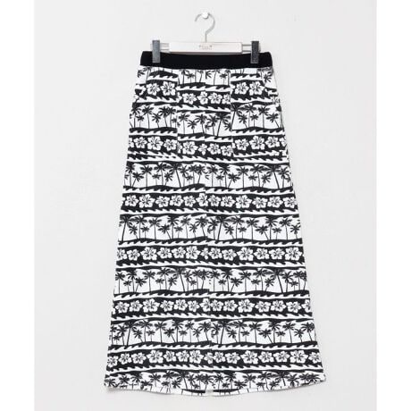 [型番:47U-4102-2024]ボタニカル柄やトライバル柄、パームツリーやバナナリーフ柄を組み合わせたスカート。ハワイの自然を感じさせるデザインで、やわらかな裏毛素材が快適な着心地を実現。リラックス感がありながらも華やかさを添える一枚です。