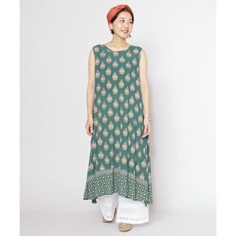 通気性の良いレーヨンクレープ素材のワンピース。インドならではのエキゾチックな色使いが美しい一枚。インドの象徴的なモチーフが描かれた幻想的なテキスタイルは他にはない特別なもの。箔プリントが妖艶さを引き立たせ、インドのバンジャビドレスを彷彿とさせる。きらびやかな一着。サイドのストリングでシルエットを変えられる仕様。同柄のカーデのとセットアップもおすすめ。