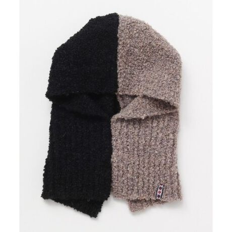 バラクラバ登場!いつも着用している服にみにつけるだけでコーデの幅が広がる。シンプルだけど少し他とはちがう個性。プクプクしたさわり心地に、同系色のバイカラーデザイン。ネイチィブ調の柄の織りテープがアクセントに。フードを被ってつけても良し。フードをはずして付け襟っぽく着けても暖かい優れもの。
