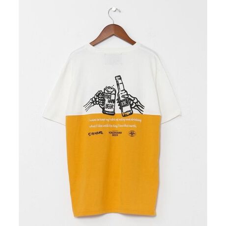【Amina×grn×横浜ビール】胸元の刺しゅうと背面のデザインがポイントのTシャツ。中国語、スペイン語、英語、ハワイ語、ドイツ語、イタリア語、タイ語、韓国語、インドネシア語、世界各国の「乾杯」の言葉を胸元に刺しゅうしてあり、背面には立体感のある乾杯するデザイン。M/Lのサイズ展開があり、ユニセックスで着られるのが魅力。