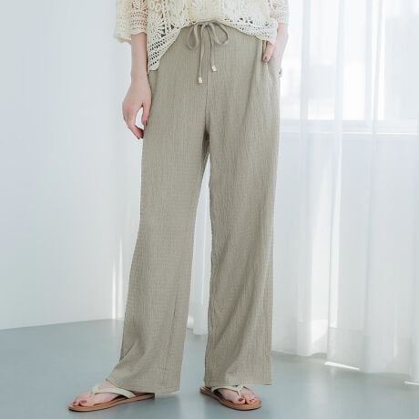 ウエスト紐の金の金具が安っぽく紐ごと全部取りました。生地がかなり薄いのでこれからの時期には快適に着れると思います。