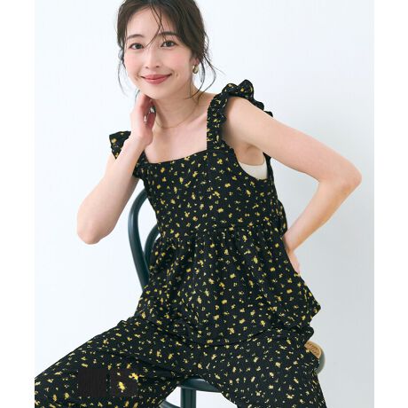 肩フリルが可愛らしい涼し気なシャーリングキャミソール
