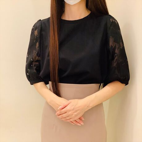 身頃のカットソーは伸縮性抜群で動きやすく、肩はシアーデザインとふんわりシルエットで優し気な印象。