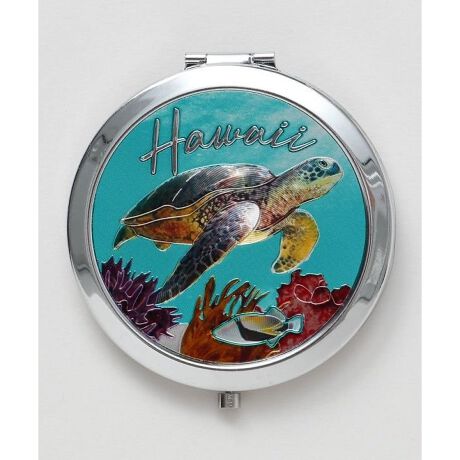 [型番:4HAP9634-2024]ハワイアンフラワービーチホヌがデザインされた、美しいメタルハンドミラー。開くと2面で片側は拡大鏡になっていてとても便利です。HAWAII直輸入。