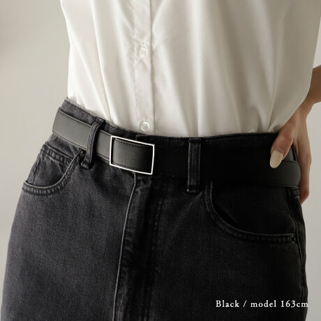 シンプルで華奢なレクタングル型バックルがポイントのベルト。