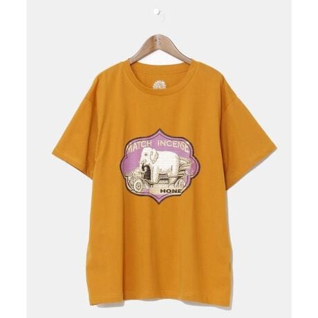 個性的な柄のマッチ香プリントと、背中のワンポイント刺繍がポイントのヴィンテージ感あふれるTシャツ。ユニセックスで着用可能。さらっとした肌触りのいい着心地。シャツとの重ね着にも大活躍間違いなし。
