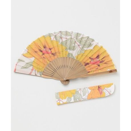 [型番:7XCP4205-2024]大輪の花を大胆に描いた華やかな竹扇子。存在感のあるデザインは、コーディネートのアクセントにもぴったり。持ち運びに便利な専用袋付きで、親骨にはカヤオリジナル刻印が入っています。