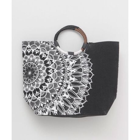 【Amina×VORRUK】 生命力あふれる大きなマンダラ。妖艶な蓮(ドッグブア)が咲き開くような、大自然の情景をイメージしたカラーリング。トリコロールカラーのリングハンドルが大きく、肩にも掛けられるマチ付きのたっぷりバッグ。開口部はマグネットボタン。裏地ありの内ポケット付き。