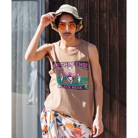 個性的な柄のマッチ香プリントと、背中のワンポイント刺繍がポイントのヴィンテージ感あふれるタンクトップ。ユニセックスで着用可能。さらっとした肌触りのいい着心地。シャツとの重ね着にも大活躍間違いなし。