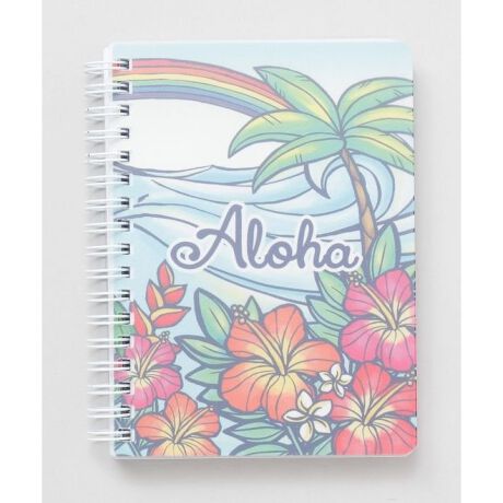 [型番:46VP4202-2024]ハワイの様々なシーンが描かれた表紙のノート。中のページもオリジナルデザイン。持ち運びやすいA6サイズです。