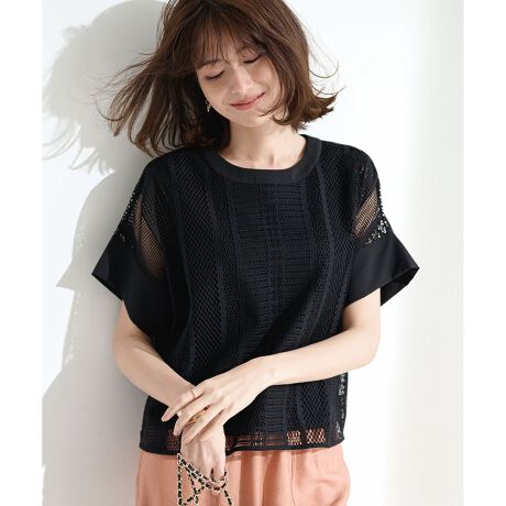 華やかで涼しげな大人のレーストップス■デザインオリジナルの総レースで編みこんだシアートップスです。襟と袖口に生地を施したブラウス見えする上品なデザインです。インナーのタンクトップがセットになっているので、涼しげなシアートップスでありながらも、肌が見えすぎずに安心して着て頂けます。程よくバランスの良いクロップド丈なので、スカートに合わせてもすっきりと見え、パンツに合わせてもきちんと見えます。デニムに合わせてキレイめカジュアルなコーディネートもおすすめです。■素材総レースのトップスは、ドイツ製の織り機で自由区オリジナル柄を時間をかけて丁寧に編みました。3種類の素材をミックスしたナチュラル見えの仕上がりです。インナーのカットソーは、綿の持つ肌触りの良さに加えて、シルケット加工を施し上品な光沢と適度なハリ感がある素材です。■同素材アイテムフレアスリーブトップス(KKWMGM0534)