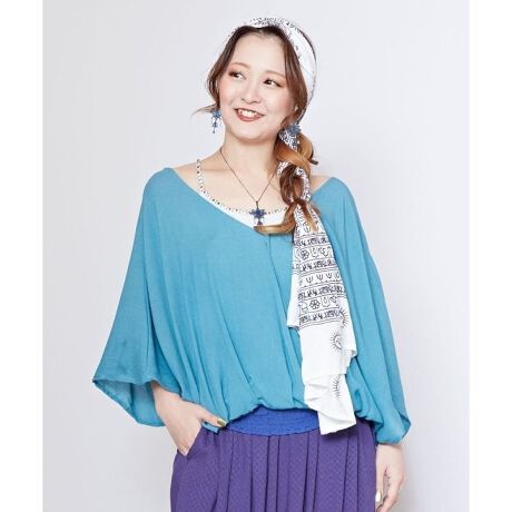 [型番:IAT-4201-2024]薄手のレーヨンクレープ素材で、さらっとした着心地のトップス。明るく映える色合いで、裾のシャーリング部分と後ろ身頃のリボンの配色がポイント。一枚でもスタイリッシュにコーデが決まる。