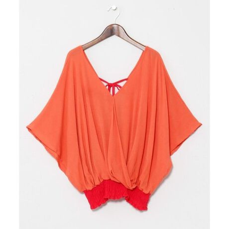 薄手のレーヨンクレープ素材を使用した、さらりと軽やかな着心地のトップス。明るく映える色合いに、裾のシャーリングと背中のリボン配色がポイント。一枚でスタイリッシュに決まるアイテムです。