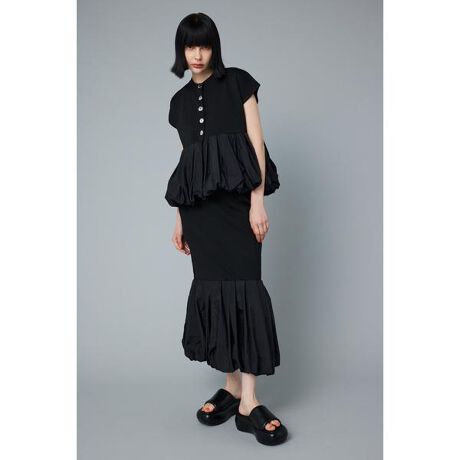 ニットと布帛素材をドッキングさせたスカート。裾のバルーンの布帛部分は軽めの素材を使用しているため、着用感も軽く、ストレスフリーに着用できます。タイトなシルエットから裾にボリュームを持ってくることでスタイルアップしてくれます。同素材のBalloon hem tops(530HST70-2390)とのセットアップスタイルがオススメ。バルーンヘムスカート