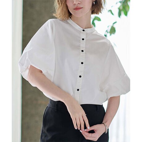 バルーンスリーブとバンドカラーが大人可愛いブラウス。◆DETAIL袖裏には裏地がついていて、ボリューム感たっぷりのバルーンスリーブに。全カラーブラックの釦で配色デザインになっているのがポイント。ボトムスに裾をインしても綺麗にきまる丈感に設定。◆FABRICきちんと感も演出できるハリのあるコットン生地を使用。[型番:BBXU1432]