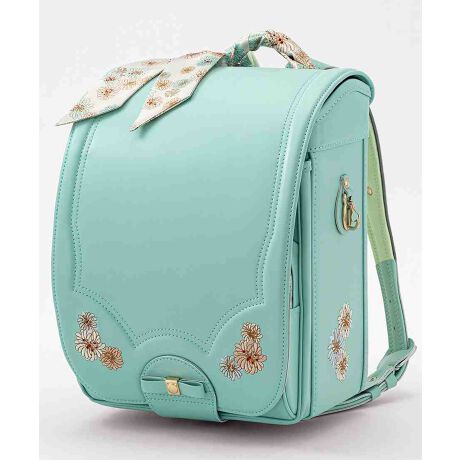 優雅な曲線を描いたかぶせのラインがフェミニンな印象を与えつつ、クリザンテームの刺繍とさりげないリボンで愛らしさを添えた、ガーリーなランドセル。