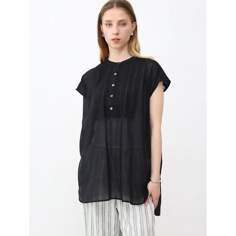フロントにピンタックをあしらったフレンチスリーブブラウス。空気を含み、ふんわりとしたルックスと涼し気な透け感がポイント。さり気なく二の腕をカバーするフレンチスリーブとゆったりとした着丈は安心感がありながら、前後差のある裾が抜けを与えるバランスのとれた一枚です。