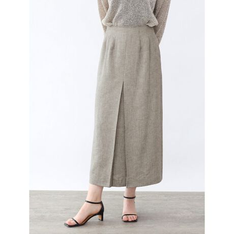 トレンドのラメ混の麻素材を使用したフロントタックが特徴のスカート。ニュアンストーンにこだわった4色展開のうち、19ダークグレー、32杢ベージュにはヘアラインストライプを施し表情感をプラス。すっきりとしたロング&リーンの美しいシルエットが魅力ながら、後ろスリットで足さばきの良さも確保。ウエストは後ろのみゴム仕様で綺麗な仕立てをキープしながら、履き心地の良さが嬉しいポイントです。