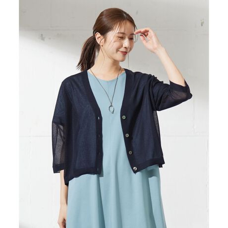 シアー素材で暑い時期にも活躍する、清涼感のある印象のVネックカーディガン。程良い透け感とハリ感でボディラインを涼しげにカバーし、ワードローブに1枚あると日よけ対策にも重宝するアイテムです。袖ぐりと袖幅を広めにしているため、ボリュームスリーブのトップスの上にももたつくことなく着用いただけます。合わせるアイテムを選ばないシンプルなデザインで、カジュアルからオフィスまでシーンレスに大活躍◎。カラーは、清潔感のあるホワイト(#001)、柔らかく女性らしいベージュ(#033)、どんなカラーにも合わせやすいネイビー(#075)の3色展開です。