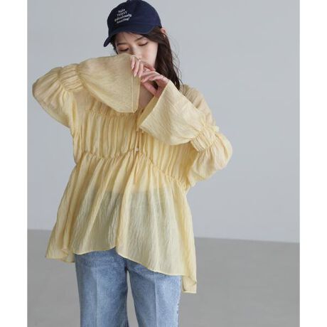 ネック周りのギャザーと胸元にシャーリングを施し、ふんわりとしたシルエットのブラウスです。ギャザー部分は柔らかく伸縮性があり、キャンディスリーブの袖口はたくし上げやすくて着心地が良い仕上がりです。フロントのリボンとシェル釦をポイントにでき、開閉したままでも着用可能。ワッシャー感のあるラフな表情の合繊素材を使用しています。※モデルの着用画像の場合、光の当たり具合により、実際の色味と異なって見えることがございます。色味は、商品単体の画像をご参照ください。