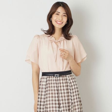 フリルが顔周りを華やかに見せ、中心には細いリボンを結んだエレガントなブラウスです。