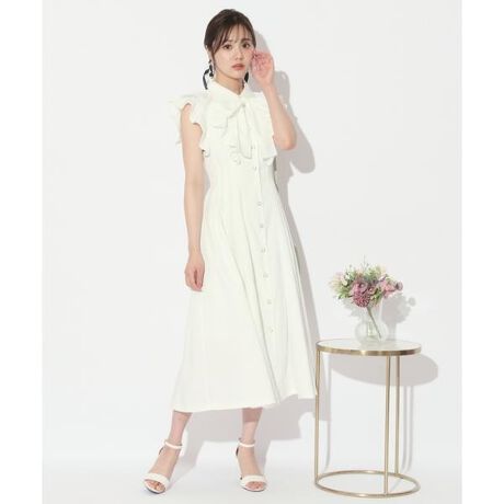 リボンタイ×ラッフルフリルのボリュームたっぷりなシャツワンピース【Design】・このワンピース1枚で着映えする、ノースリーブのシャツワンピース。・ボリュームのあるラッフルフリルが肩周りをカバー◎・大きめのリボンタイが顔周りをパッと華やかに仕上げてくれます。・リボンタイは取り外し可能なので、気分に合わせてアレンジが可能。・ウエストにはタックを施し、美しいウエストラインとフレアシルエットを演出!・ウエストバックはシャーリング&レースアップ仕様でお好みに合わせて調節できます。・フロントオープン仕様。【Fabic】・シワになりにくい素材を使用。・程よいハリ感のある裏地付き。・ホワイト、ピンク、ネイビーの3色展開となります。【Care】ドライクリーニング