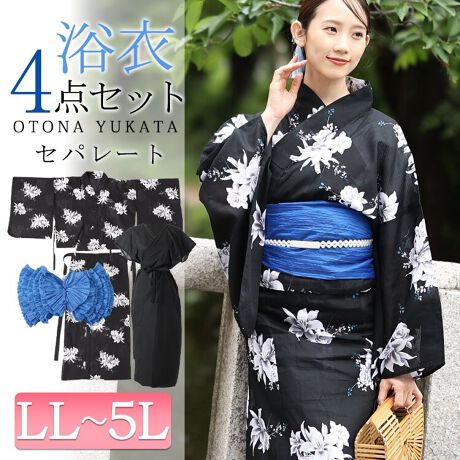 【大きいサイズ】 百合ブーケ柄上下セパレート浴衣&結び帯&インナー4点セット 大きいサイズ 浴衣 夏