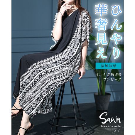 オリエンタルなオルテガ柄が魅力的なワンピースは、モノトーンでデザインされ派手になり過ぎず、大人なモード感を引き立てます。接触冷感機能のある生地で仕立てられ、汗ばむ季節にもひんやりとした着心地に。無地との切り替えデザインで華奢見え効果を生み、ポンチョのような大判シルエットで窮屈感もありません。リゾートに訪れたようなリラックス感が堪らない、一枚で様になるワンピースです。