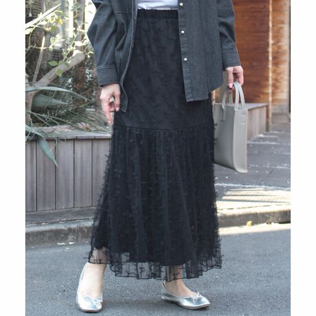 立体感あるリボンモチーフのチュール素材を使ったロングスカート。