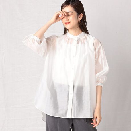 透け感と光沢感が魅力のバンドカラーブラウスです。