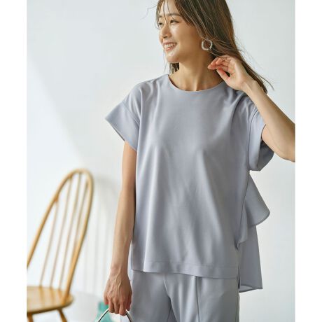 ■デザイン夏に嬉しい機能付きトップスは、フロントはTシャツ見えするすっきりとしたシルエットに、後ろヨーク下から前脇にかけて流れる美しいフリルシルエットが華やぎを与えてくれる一枚です。フリルが脇側からちらりと覗く様に脇線を少し前側に切り替えてデザインしました。袖口は2重仕立てで厚みを出し、しっかりとさせる事で腕のラインを拾わず、脇下のマチなど気になる部分はしっかりとカバー。フロントがシンプルだからこそ、少し甘めなバックディテールでも大人が気負わずに着ていただけるよう仕上げたアイテムです。
