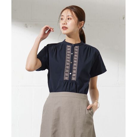 胸部分の細いブザムに配色の生地刺繍を施し、ブラウスライクに仕上げたカットソー。ストンと裾にかけて程よく広がるAラインのシルエットは、体型をカバーしつつも上品な印象をプラス。ヒップが隠れる丈で、パンツともバランスよく合わせられます。暑い時期にも、1枚だけで楽に着映えるアイテムです。カラーは、クリーンなホワイト(#001)、明るく柔らかな色味のライトグレー(#003)、ベーシックでオンオフ兼用のネイビー(#075)の3色で展開します。