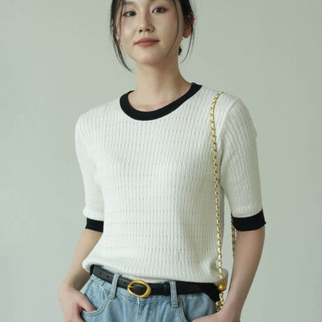 上品なケーブル編みデザインのサマーニット♪<br>バイカラーがアクセントになりオシャレなアイテムです。<br>程よくスリムなシルエットが女性らしい◎<br>パンツと合わせてカジュアルにも、スカートと合わせて清楚な着こなしもできる一枚です。<br><br>■注意事項<br>・お使いのモニターや端末により、質感・色合いが実際の商品と異なって見える場合がございます。<br>・表記サイズは測り方によって1〜2cmの誤差が生じる場合がございます。ご了承くださいませ。
