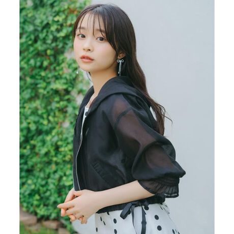 ボリュームのあるキャンディスリーブで甘さを加えたサイドリボンパーカー【Design】・サイドリボンで丈感をアレンジできるシアーパーカー。・ボリュームのある袖をきゅっとしぼったキャンディスリーブが、スウィート感を演出します。・ふんわりと広がるスリーブで、二の腕もさりげなくカバー◎・手首の部分がシャーリングゴム仕様になっているので袖丈を調節できます。・ワンピースやボトムスともバランスの取りやすいショート丈。・春夏のアウターとしてはもちろん、空調対策としても活躍してくれます。・フロントファスナー仕様。フード付き。【Fabric】・シアー感のある素材を使用。・ご自宅でお手入れが出来るのも嬉しいポイント♪・ホワイト、ピンク、ブラックの3色展開となります。【Care】手洗い可能