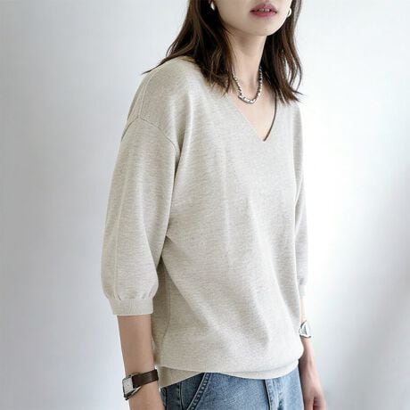 二の腕をふわっとカバーする六分袖に、デコルテをきれいに魅せるVネックとラウンドネックで、抜け感のあるヘルシーな印象に。